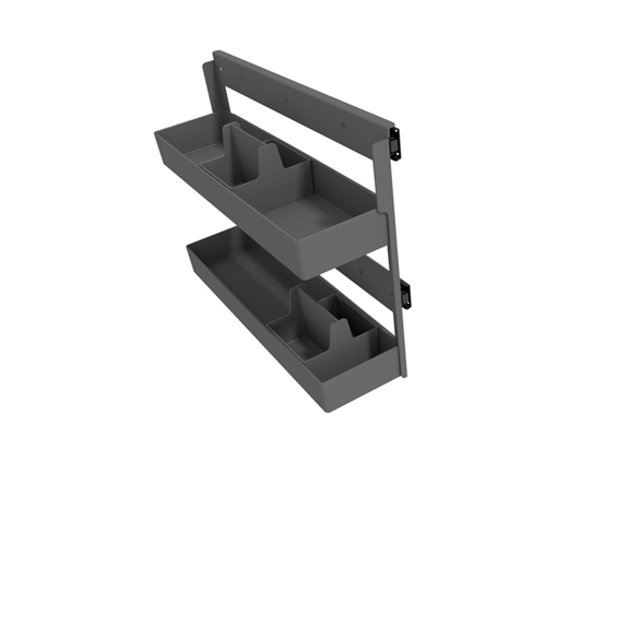 Sous-Chef is the latest innovative solution from Gollinucci designed to organize internal kitchen spaces. Equipped with adjustable compartments, the product allows for easy access for all cooking ingredients, accessories and cutlery. In addition to orion grey, the product is also available with a knife holder (in walnut finish), and can be used in cabinets from 150mm-600mm. The product is suitable both for cabinets with standard doors and for the most common types of drawer (Blum®, Grass®, Hettich®, FGV®…).