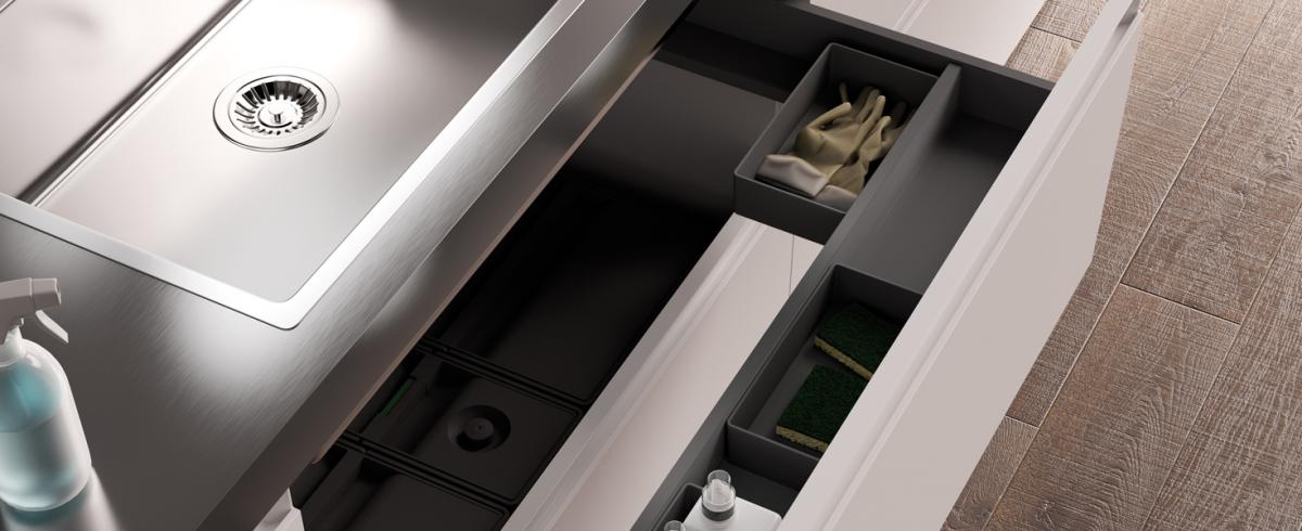 Struttura autoportante in alluminio verniciato. Studiato per i sistemi cassetto Blum Legrabox®, Blum Tandembox®, Grass NovaPro®. Disponibile in varie altezze. Adattabile ai vari tipi di largezze e di profondità. Dotato di vaschette removibili. Particolarmente adatto per abbinamenti con raccoglitori della Collezione Première e Sistema 9XL.