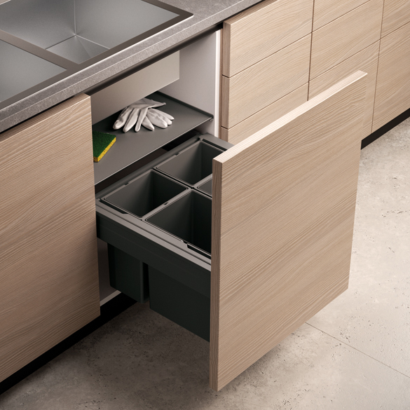 Questa linea è disponibile per basi dalla 300mm alla 900mm e con diverse altezze, profondità e combinazioni di secchi.