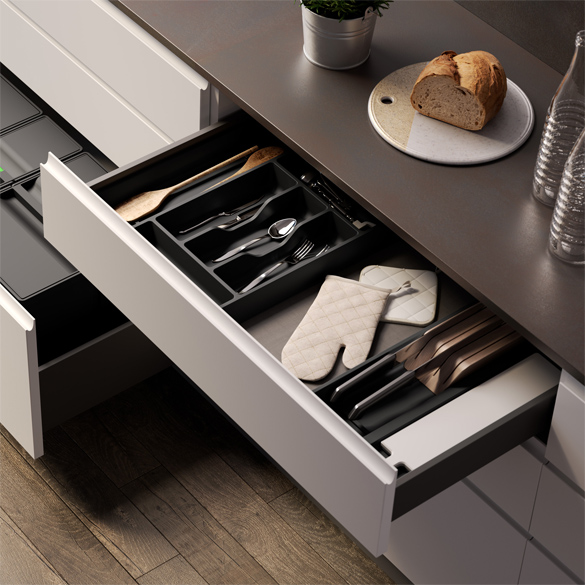 I moduli disponibili consentono di creare numerose varianti di prodotto adattabili a differenti larghezze di cassetto. Combi è resa ancora più funzionale dalla possibilità di accessoriare i moduli con portacoltelli e tagliere.
