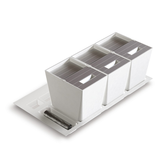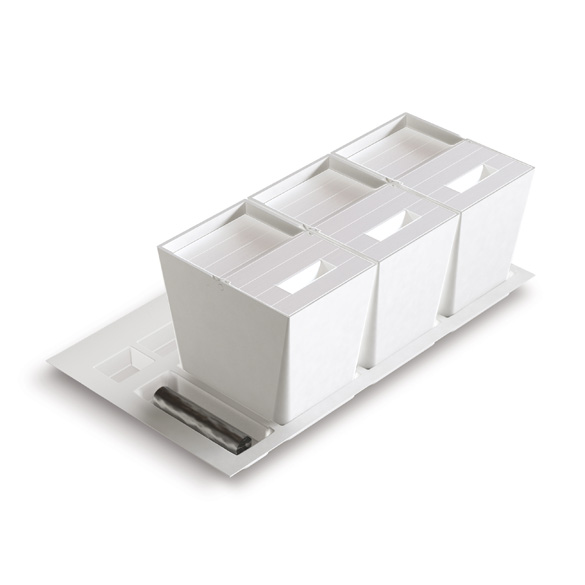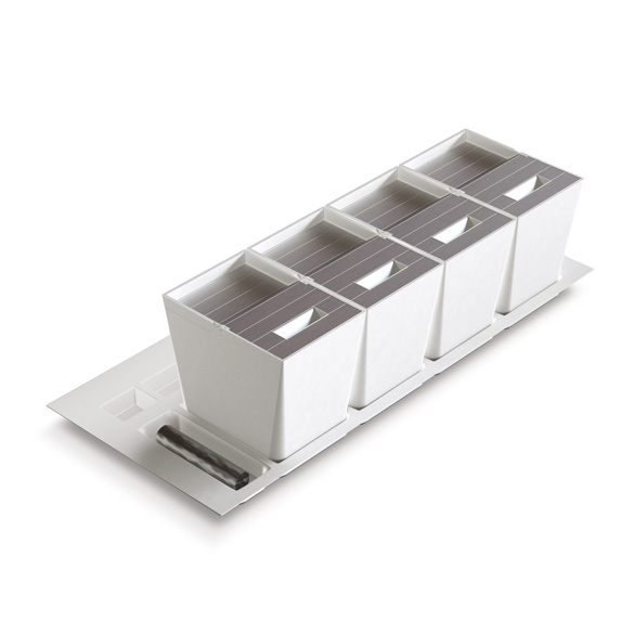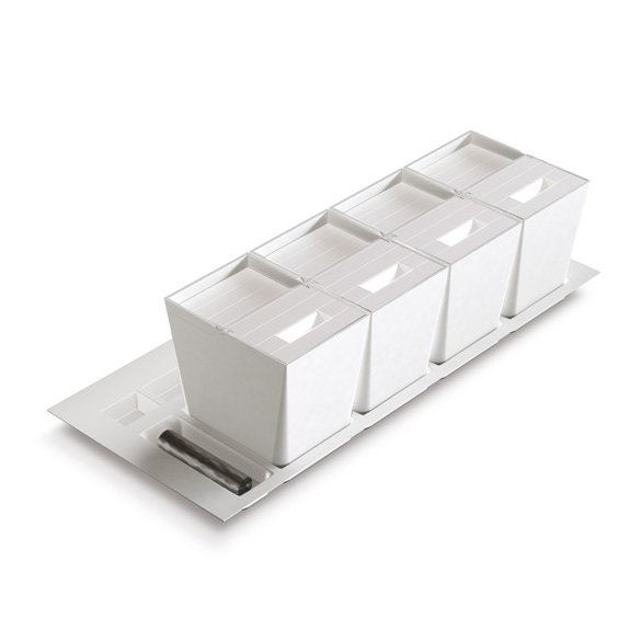 Il vassoio che ospita i secchi è rifilabile a misura e per le profondità maggiori sono disponibili compensatori di profondità in acciaio inox.