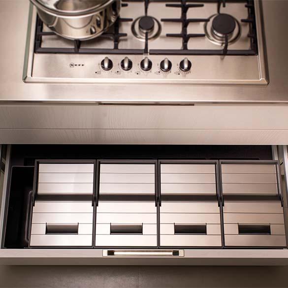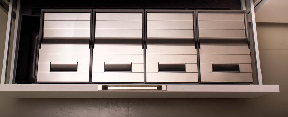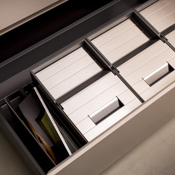 Questa linea è disponibile per cassetti dalla base 600mm fino alla base 1200mm, in due altezze e con la possibilità di aggiungere portariviste e portadetergenti.