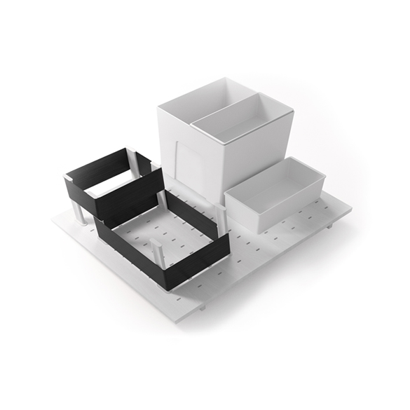 Art. 1350: organizzatore di spazio per cestone con fondo in legno forato, dotato di 12 elementi divisori, 3 fasce eleastiche e 3 scatole multi-uso removibili.